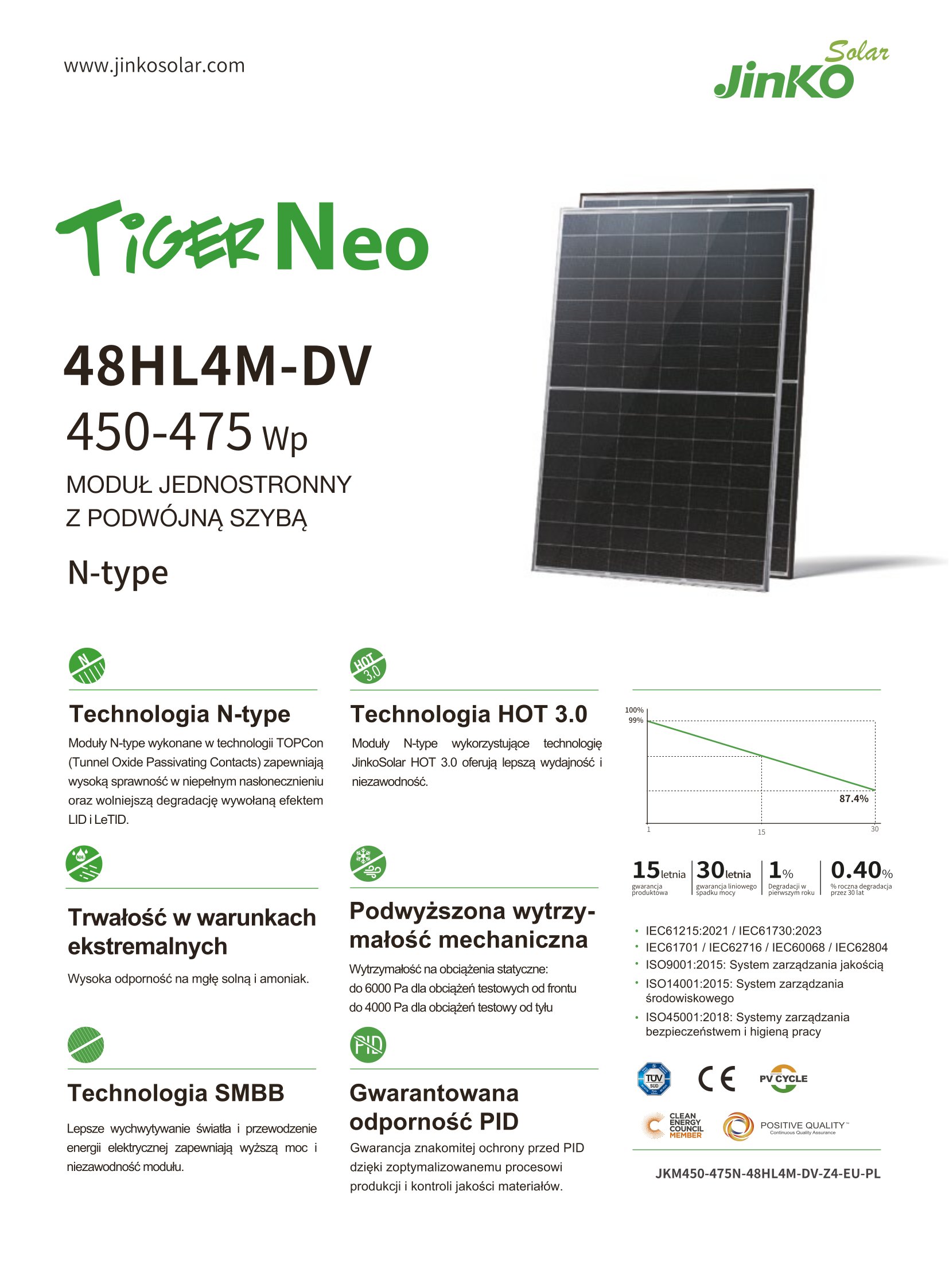 Gwarancja na uzysk mocy: 30 lat (z liniową degradacją poniżej 0,4% rocznie)