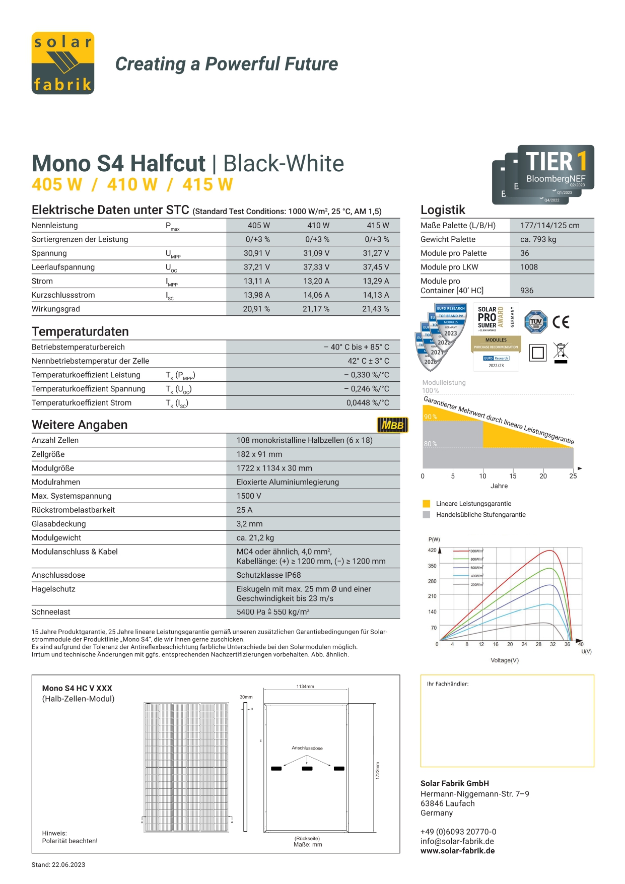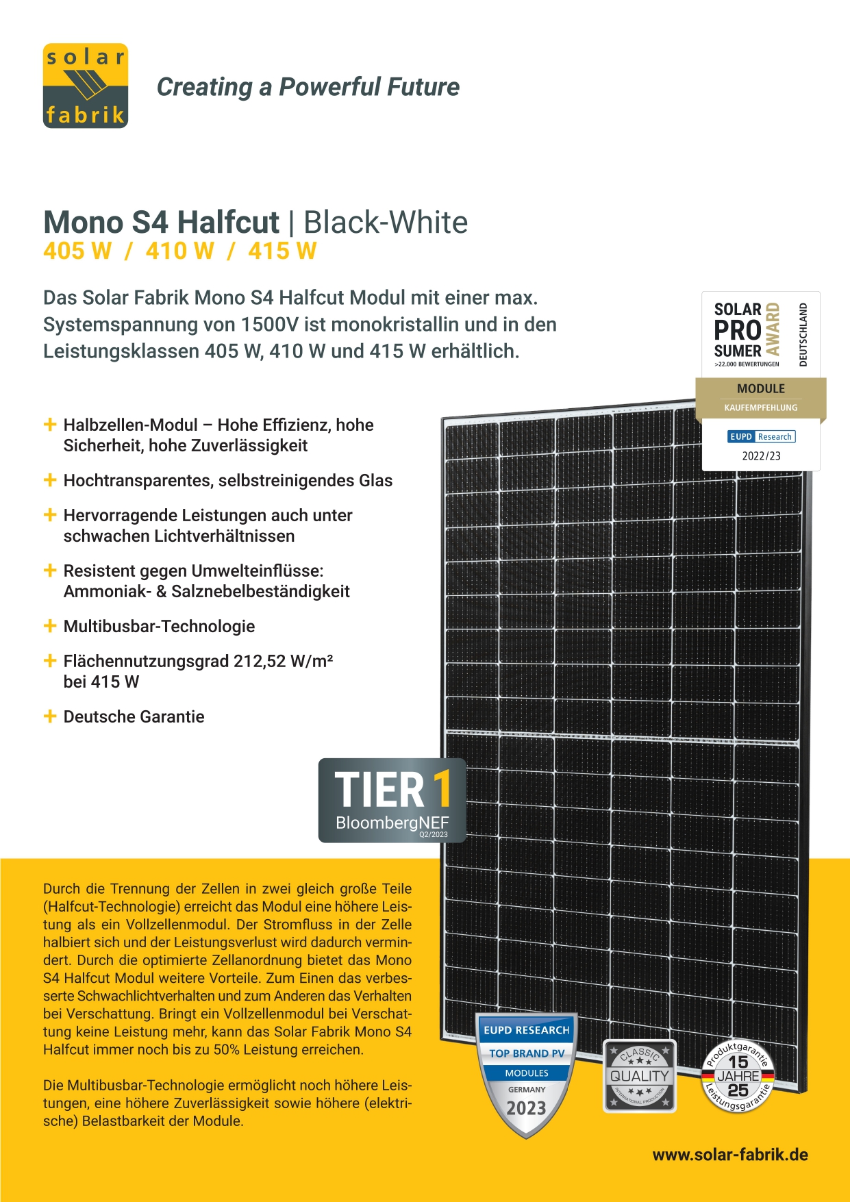 Solar Fabrik Mono S4 HC 415W Black-White to wysokowydajny moduł fotowoltaiczny oparty na technologii monokrystalicznej half-cut, zaprojektowany z myślą o maksymalnej efektywności i niezawodności w instalacjach domowych oraz komercyjnych.